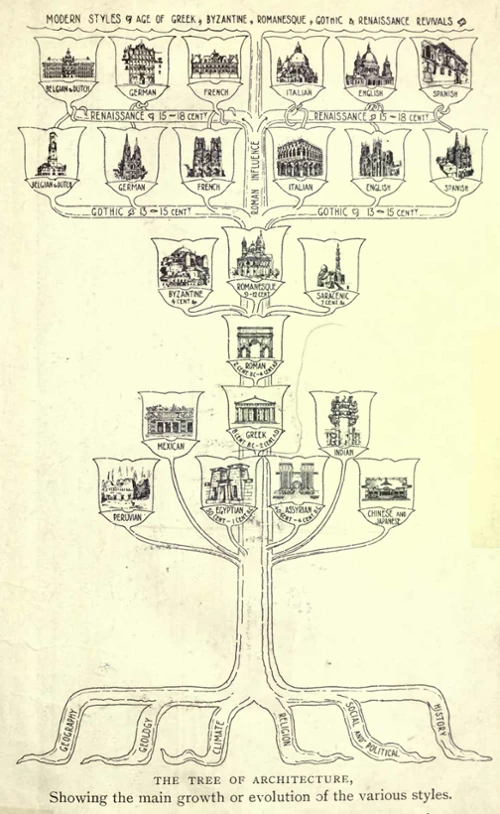 Tree of Architecture, frontispice de l’ouvrage de Banister Fletcher, A History of Architecture on the Comparative Method, London, Athlone Press, University of London, 1896, dans l’édition de 1905 (© Sir Banister Fletcher, Public domain, via Wikimedia Commons)
